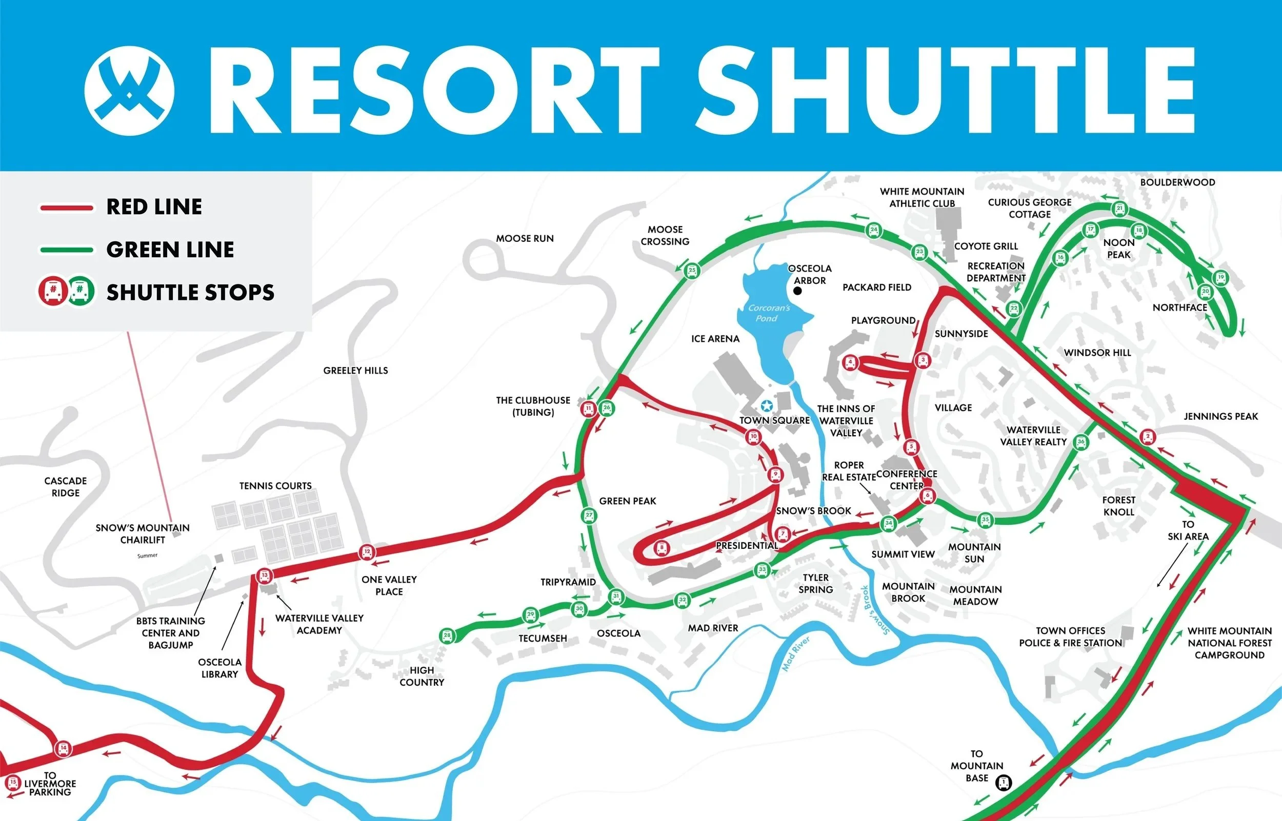 The Resort Shuttle - or “Schuss Bus”as some locals like to call it - makes numerous stops throughout Waterville Valley, including at the ski area, lodges, condominiums, White Mountain Athletic Club, Town Square, and more.